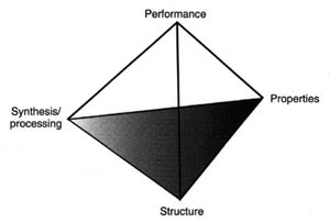 The Merton Flemings tetrahedron of materials science, structure, properties, processing, and performance [cf. figure on the right]. To me processing and performance are pretty synonymous, but this is a very current view nowadays. The older view, and it is one that I still like because of the similarity between properties and performance, is a two-dimensional matrix with the classes of materials as one way of slicing the field and then materials science and engineering as orthogonal cuts to this : the concern with the properties and the processing and performance of materials from all of the four major classes. It is interesting that the older societies, such as the American Society for Metals, which used the acronym ASM, still uses the acronym, but it is now called “ASM International : the Materials Society”. So they have pushed metals alone off at arm’s length. They are staying with the times.